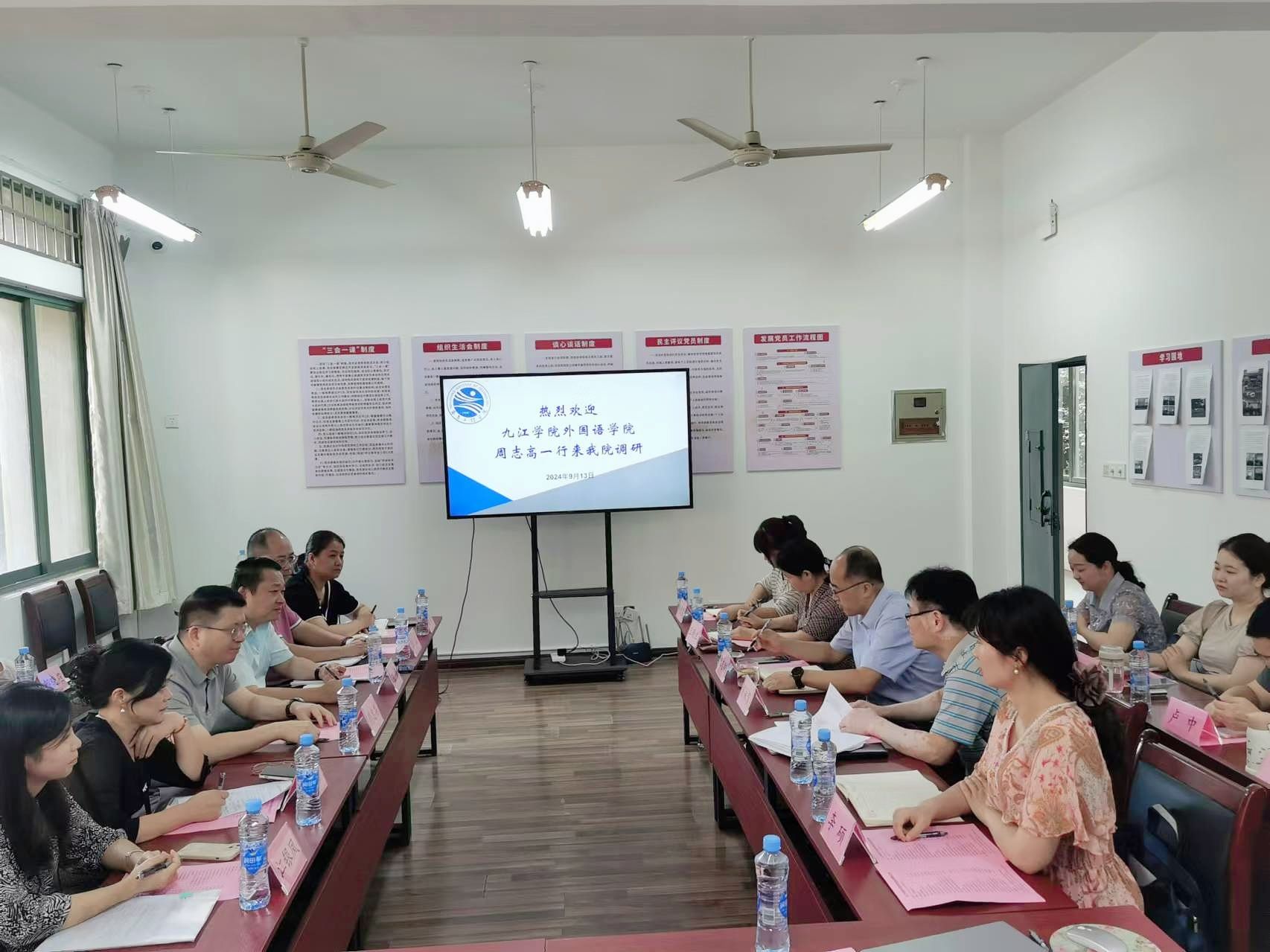 9月13日上午,九江学院米乐mile官方网站院长周志高一行10人来米乐官网调研交流,就本科教育教学审核评估、硕士学位授权点申报以及大学外语教学改革等议题进行深入探讨。米乐mile官方网站全体班子成员、部分教研室主任、专业负责人和相关工作人员参加座谈。