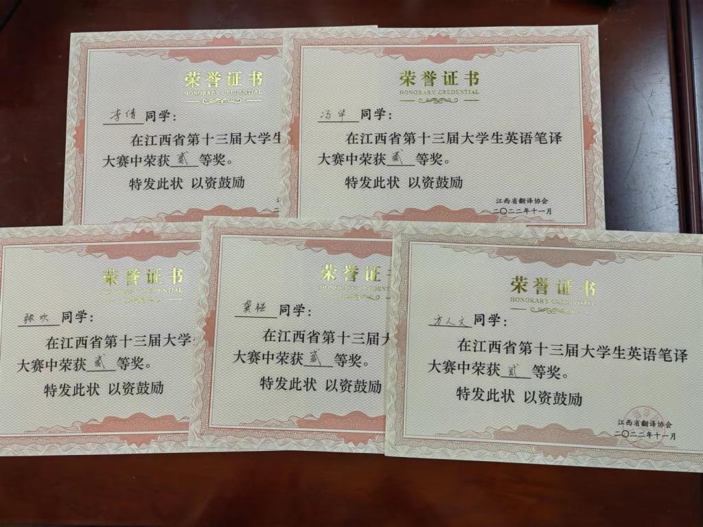米乐官网学子在江西省第十三届英语笔译大赛中喜获佳绩