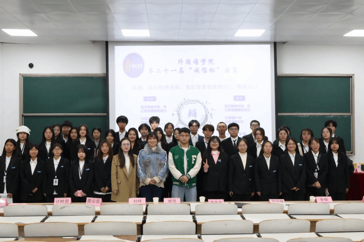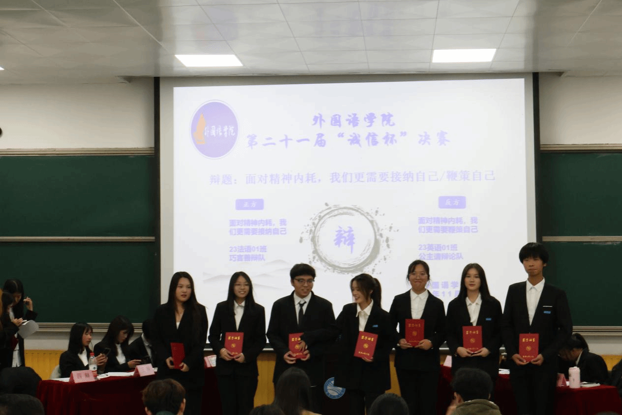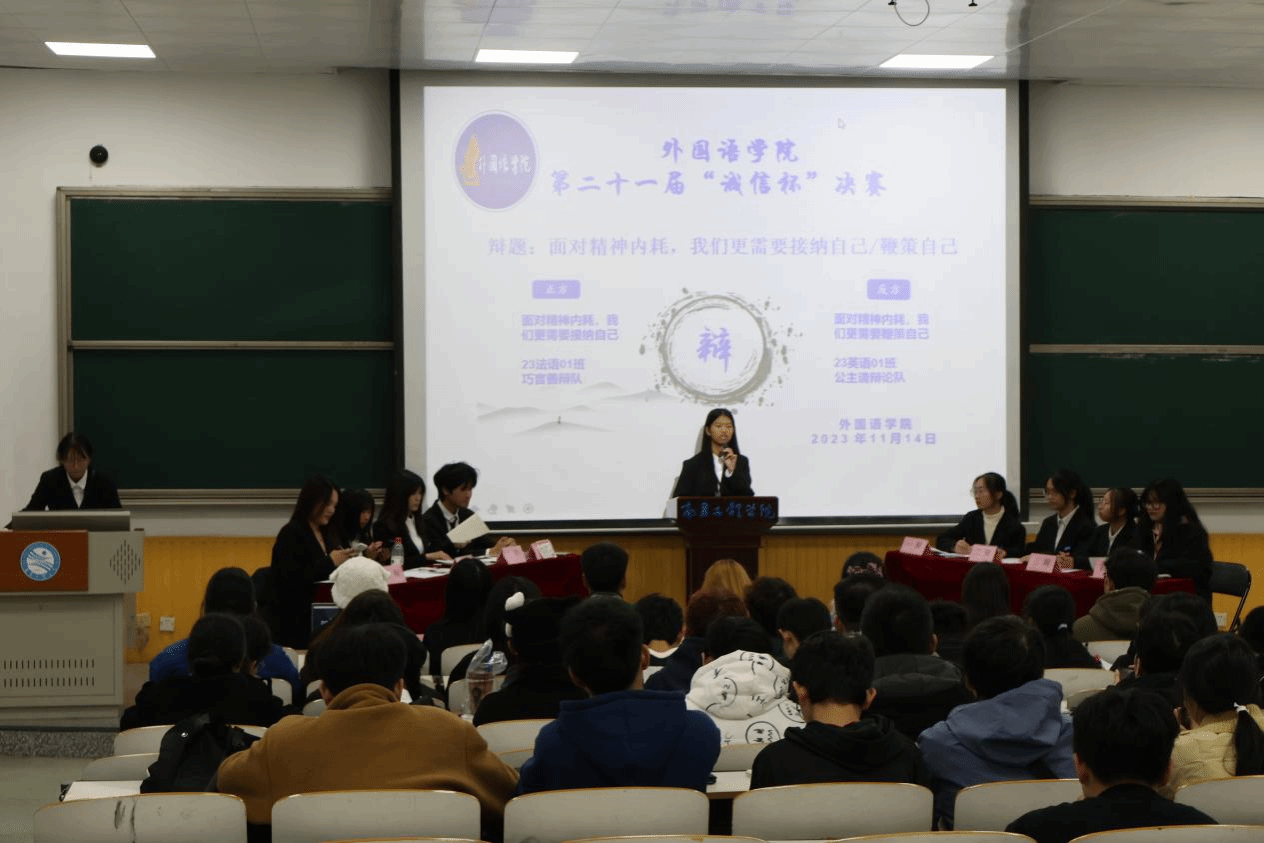 经过辩论初选赛、复赛,最终有两支队伍杀入总决赛。冠军争夺赛以“面对精神内耗,我们需要接纳自己/鞭策自己”为辩题,共分立论、攻辩、自由辩论及总结陈词等环节。赛场气氛紧张热烈,场下观众掌声连连响起。经过一番唇枪舌战,来自23法语01班的“巧言善辩队”夺得冠军。最后,各评委代表分别为本场比赛做了精彩点评。