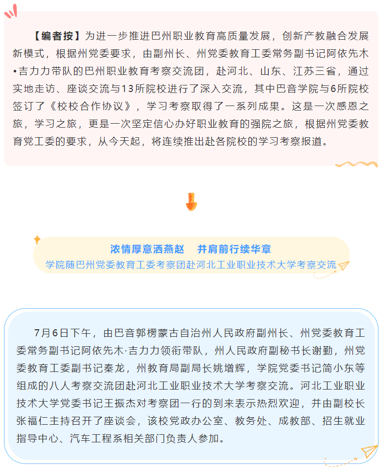 上一条: “筑梦职教路 扬帆再起航”巴音学院深化校校合作之路系列报道(二)