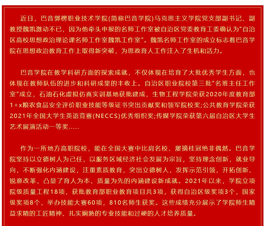 下一条: 以赛促教 以赛促学 赛教结合 赛学相融---巴音学院高技能人才培养成果丰硕