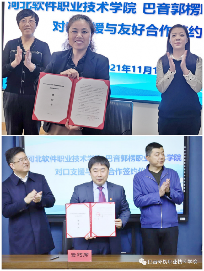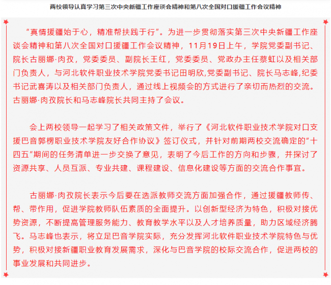 党委副书记、院长古丽娜·肉孜与河北软件职业学院党委副书记、院长马志峰签订对口支援友好合作协议