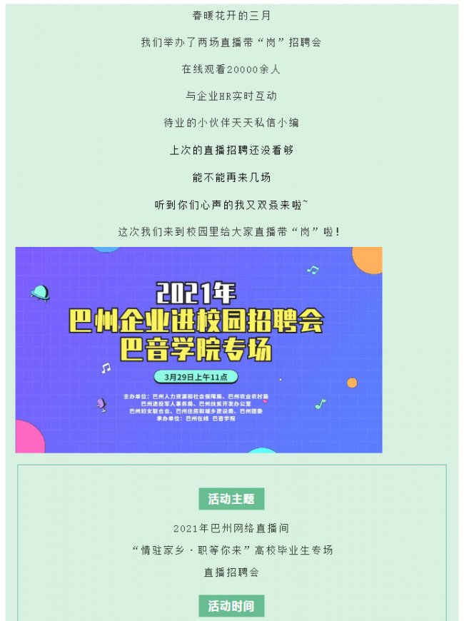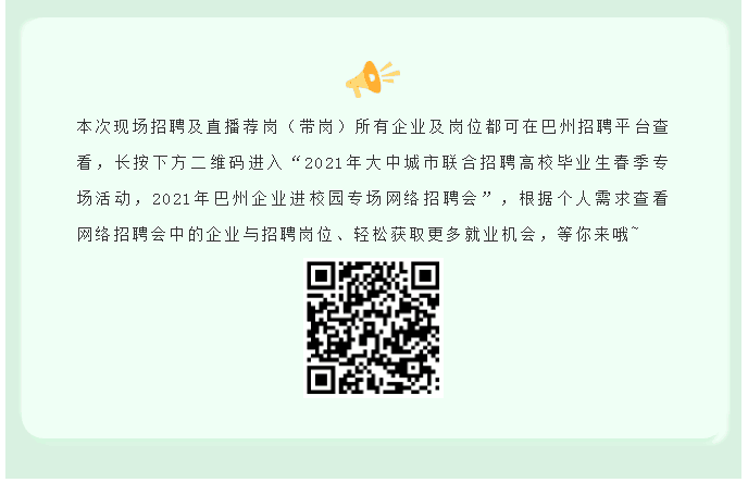 上一条: 明天上午11点!2021年巴州企业进校园直播招聘会即将开启!“职”等你来~