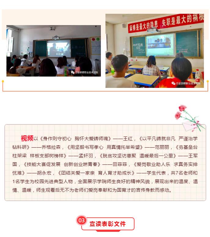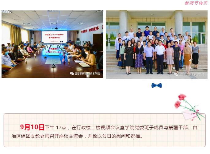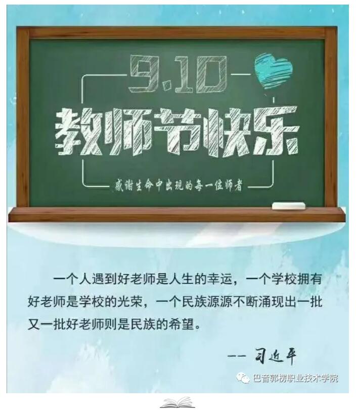 习近平总书记指出:“教师不能只做传授书本知识的教书匠,要成为塑造学生品格、品行、品味的‘大先生’。”在全社会大兴尊师重道之风时,我们是不是也应审视一下作为老师究竟应该如何做才能无愧这一职业呢?《礼记》有言:“师也者,教之以事而喻诸德者也。”今年教育部以“立德树人奋进担当、教育脱贫托举希望”作为今年教师节主题,对于教育者明确提出了立德树人的要求,要求人民教师把教书育人和自我修养结合起来,做到以德立身、以德立学、以德施教。“以德立身”就是中国优秀文化传统中的“修身”,为人师者要坚持以德性高标准完善自己;“以德立学”就是强调立德与立学、人品与学识的统一,即在授业的同时重视学生道德品质的培养;“以德施教”就是在教学中注入道德精神,让教学有思想,有灵魂,帮助学生筑梦、追梦、圆梦。前面的视频中王红副院长、乔格拉森、范丽丽等7位老师以及同学们的掠影和心声,从管理育人、教学科研、脱贫攻坚、创新创业、后勤服务等方面的展现了老师们担当作为、潜心教书育人的大德大爱,不同民族的同学们积极阳光、求实好学的可贵品质,这些优秀的老师是我们巴音学院人的缩影,正是因为有了这样优秀的榜样,才使学院有了不竭的发展动力。作为拥有近30年教龄的教育工作者,我回首往事,常常想自己为什么选择教育,又凭什么能坚持几十年如一日的在这个岗位上工作。我想就是教师这一行业本身的魅力,如同吴振财副校长一样,因为热爱这个职业,我不断学习和进步,和学院许许多多的老师一样,努力在自己的岗位上创造着自己的人生价值。
