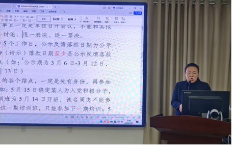 党建工作处工作人员根据2024年党建重点工作,结合各基层党组织在开展工作中存在的问题、难点等,紧紧围绕党建阵地规范化建设、发展党员流程、支部手册撰写规范、党员组织关系转接等内容进行了指导,并详细讲解了工作的具体要求及注意事项。