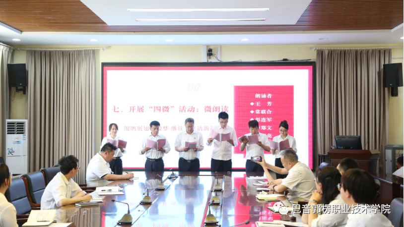 会上还开展了题为“鲲鹏展翅职教梦 继往开来谱新篇”的微朗读活动,由宣传部、统战部党员同志集体朗诵。他们紧紧立足院情学情、牢牢围绕学院近年以来所取得的内涵建设和高质量发展成就、深切展望未来发展,将理论与实际相结合、将发展建设与语言文字相结合,由衷表达了巴音学院人对学院的感情至深且真,极大触动了每一位参会同志。