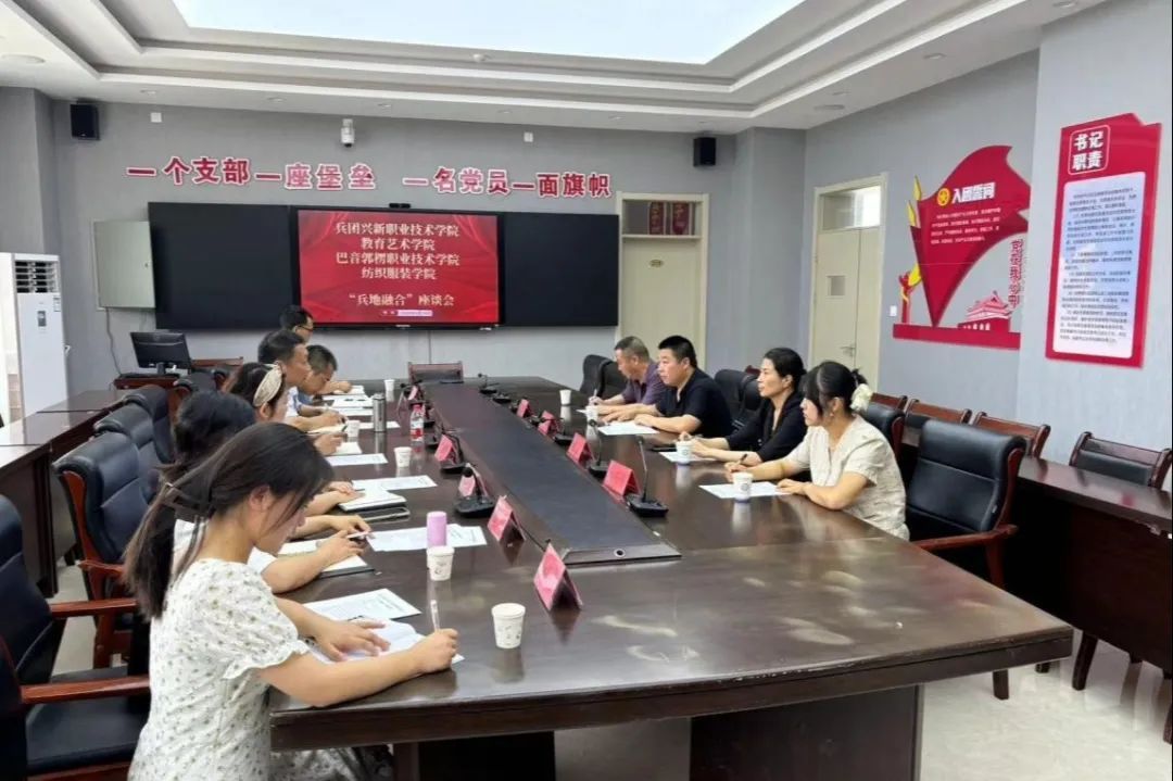 深入贯彻落实兵地融合发展工作决策部署,始终坚持“兵地一盘棋”理念,不断探索新时代兵地教育深度融合发展的新进程、新举措,凝聚工作合力,持续深入做好兵地融合发展各项工作,促进兵地教育质量共同提升。6月14日上午,sunbet申搏官方网站(以下简称巴音学院)纺织服装学院副院长王庆、张静一行4人赴兵团兴新职业技术学院开展兵地融合发展工作交流活动。兵团兴新职业技术学院教育艺术学院书记赵岁峰、院长高宏伟、副院长孙永进及服装专业教师参加了此次交流活动。