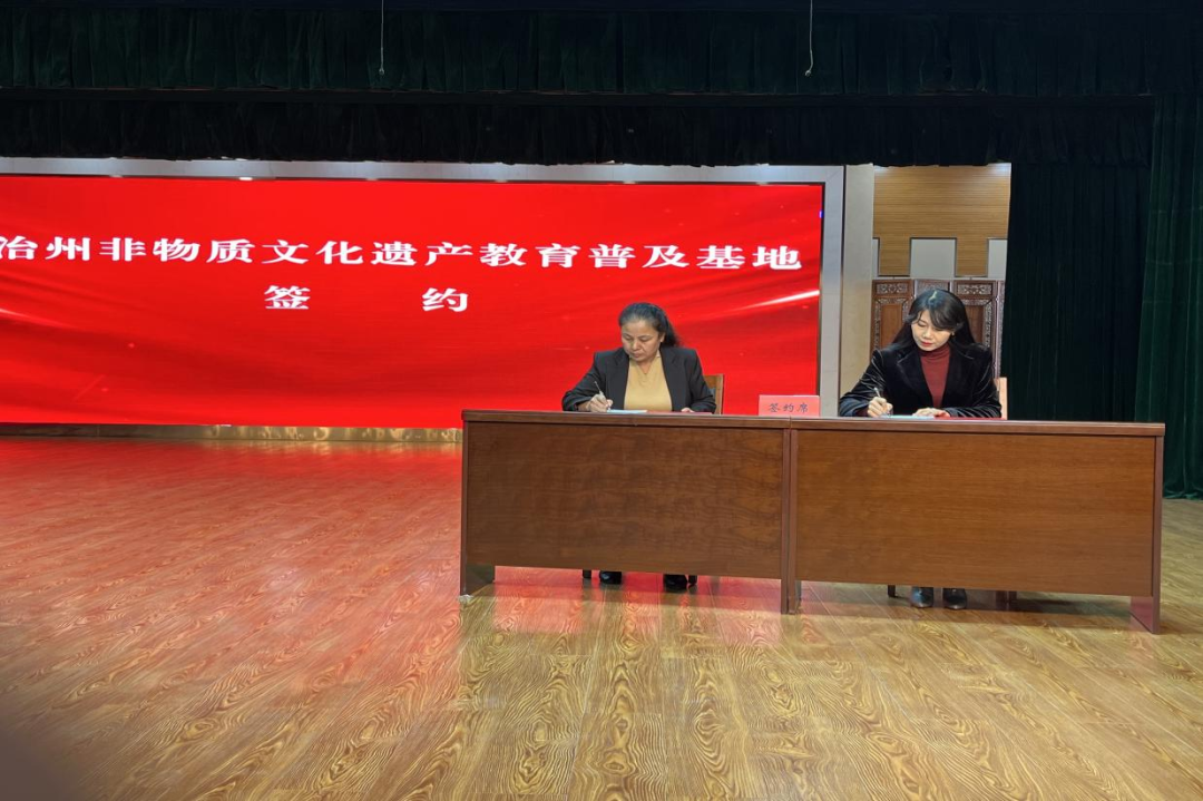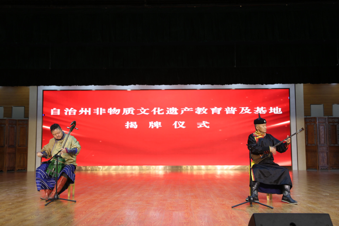仪式上,翟海燕介绍了“托布秀儿”、“江格尔”等非遗项目,与学院签订了非物质文化遗产教育普及基地协议,双方共同为基地揭牌并赠送了非遗项目乐器。