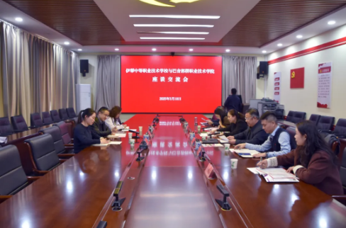 3月18日,sunbet申搏官方网站与伊犁中等职业技术学校召开交流座谈会。伊犁中等职业学校党委副书记、校长戚豹,伊犁中等职业技术学校招生就业指导主任玛依沙尔·亚库甫江、孙海哨,学院党委副书记、院长古丽娜·肉孜,党委委员、副院长陈宇,各职能部门、二级学院相关负责人参加此次会议。会议由陈宇主持。