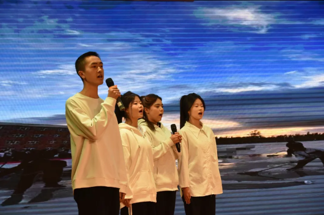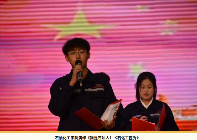 石油化工学院以石油化工产业链为叙事脉络,通过诗歌朗诵与科技艺术融合的形式,展现从原油开采到高端化工的辉煌历程,讴歌石油化工人的工匠精神与创新担当。