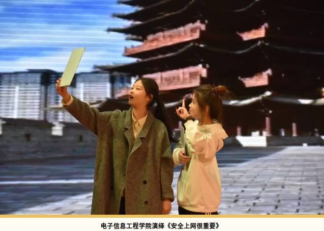 电子信息工程学院以大学生网络生活为切口,通过网络攻击案例的情景再现,融合电子信息专业技术,网络安全问题都将在他们的表演中找到答案。
