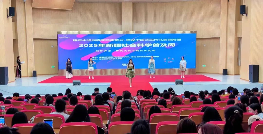 在产教融合示范园,库车中等职业技术学校师生共同观看了由纺织服装学院主办的“铸牢中华民族共同体意识 建设中国式现代化美丽新疆”——2025年新疆社会科学普及周活动“织梦讲堂·传统文化与现代化交响”传统服饰走秀专场活动。活动以服饰为媒介,将新疆传统文化元素与现代设计理念融合,生动展现了职业教育在文化传承与创新发展中的独特价值。