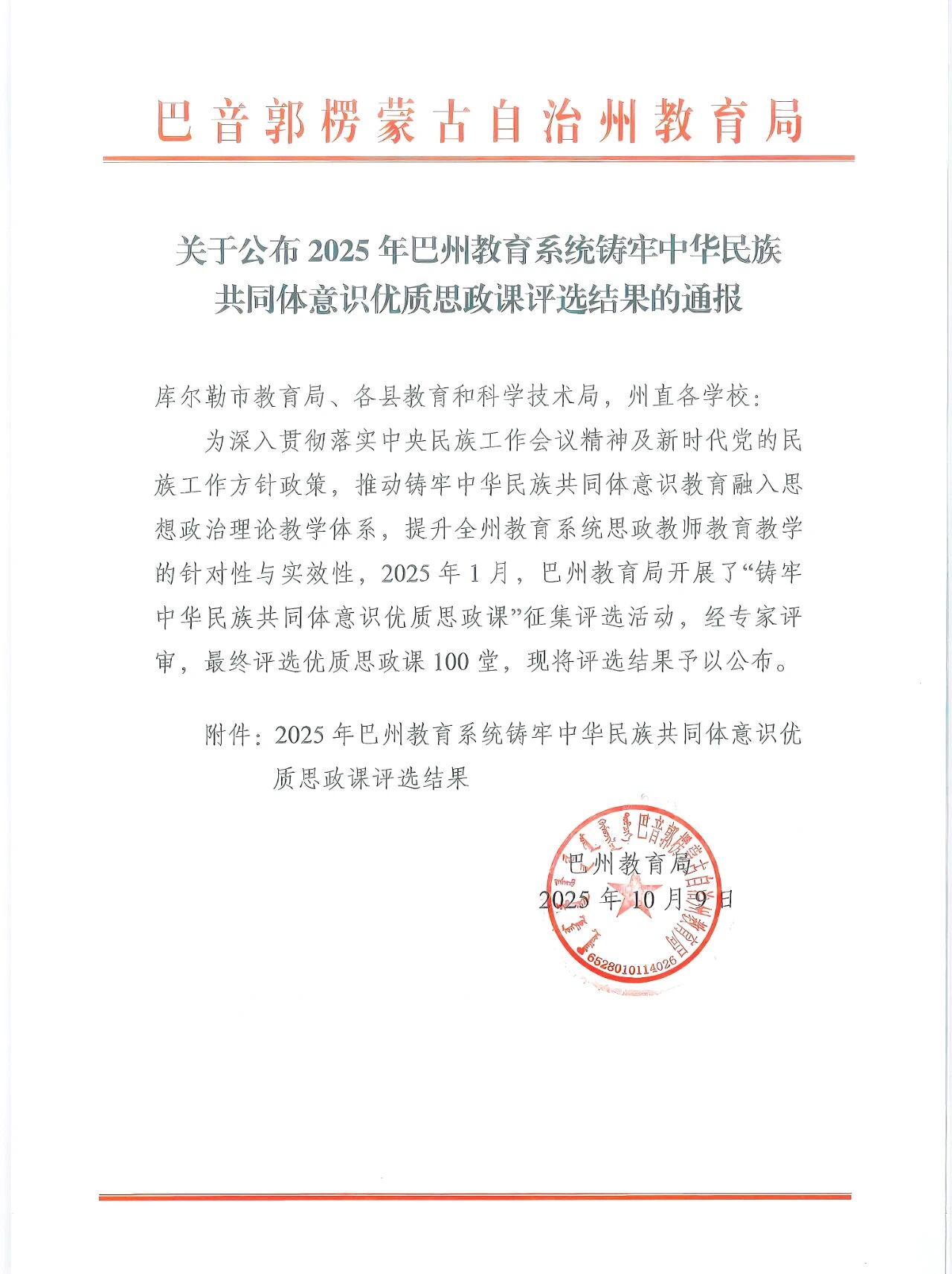为深入贯彻落实中央民族工作会议精神及新时代党的民族工作方针政策,推动铸牢中华民族共同体意识教育融入思想政治理论教学体系,提升全州教育系统思政教师教育教学的针对性与实效性,2025年1月,巴州教育局开展了“铸牢中华民族共同体意识优质思政课”征集评选活动,经专家评审,最终评选优质思政课100堂。