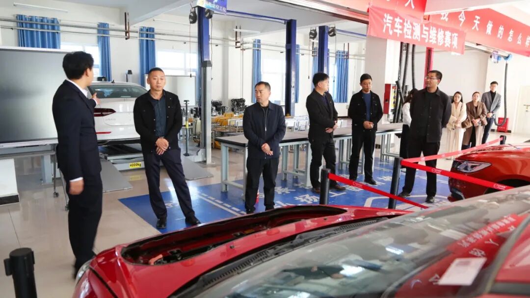 调研组首站考察交通工程学院实训室。徐明介绍,学院2020年投入100万元建成汽车运用技术实训基地;2025年再申报自治区600万元项目,拟打造智能新能源汽车检测维修实训基地。基地建成后将设12个实训室、配备94套设备,覆盖智能网联汽车传感器教学、无人驾驶实训等领域,实现 “从基础教学到企业实战”全链条覆盖。王荣焕对“设备与行业同步、教学与岗位衔接”理念予以高度认可,并参观了学院思想政治教育实践基地与机械电气工程学院实训室。