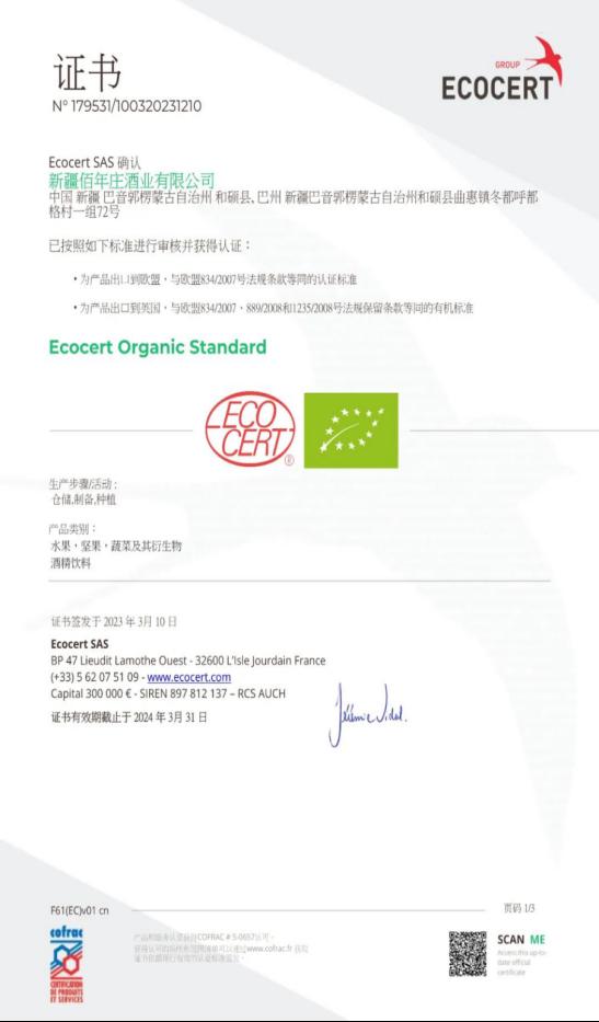 佰年酒庄具备现代化的管理机制,已通过ISO9001质量管理体系、HACCP体系等认证,种植基地原料酿酒葡萄已取得欧盟有机和中国有机双认证,佰年酒庄生产的产品获得了“葡萄酒酒庄酒证明商标”的使用授权。