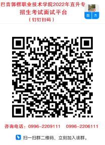 请参加巴音郭楞职业技术学院2022年直升专招生考试的同学,按照规定时间提交《2022年优秀中职毕业生直升高职(专科)申请表》、印证材料和公示材料,并于4月10日12时前完成报名。报名结束后请于4月10日18时前扫描下方二维码,填写相关信息,申请提交加入"sunbet申搏官方网站2022年直升专-招生考试面试平台",我院将对考生身份核实,并进行考试分组,考生因个人原因未申请进入钉钉考试平台,没有进行直升专线上面试,视同缺考。