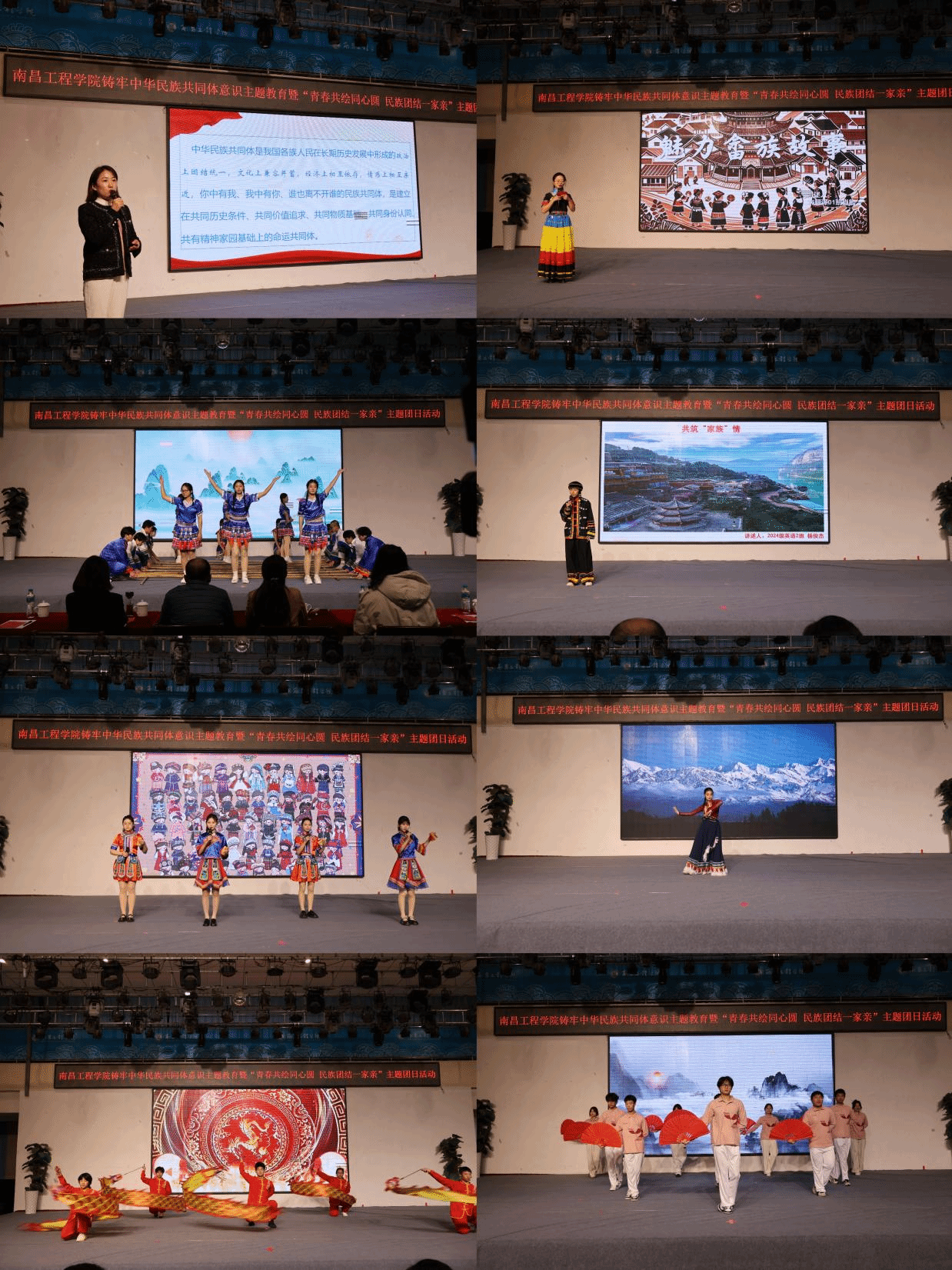 活动在全体师生齐唱中国共青团团歌——《光荣啊,中国共青团》的激昂旋律中拉开序幕,统战部张存岩以《汇聚青春力量 共筑民族团结之魂》为题为大家上了一堂微团课,她以生动的民族团结实践案例和故事为大家阐释了谁是“中华民族共同体”、“中华民族共同体”的内涵是什么及青年大学生如何积极投身促进民族团结实践。在民族文化展示环节,各族学生代表分别带来了竹竿舞《上春山》、快板《中华民族大团圆》、彩带龙表演 、藏族舞蹈《天浴》、太极扇《少年中国说》等精彩节目,来自畲族和土家族的学生代表分享了他们的民族发展史和民族文化。活动在全场师生共唱《爱我中华》的温情而又力量的歌声中圆满落下帷幕。