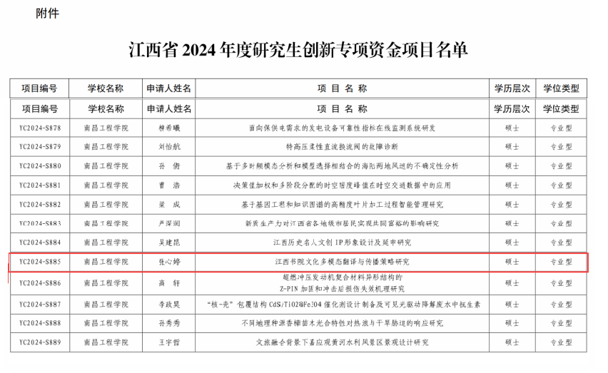 近日,米乐官网23级英语笔译专业研究生张心婷申报的《江西书院文化多模态翻译与传播策略研究》项目成功获批江西省研究生创新专项资金项目立项,展现了米乐官网研究生的学术风采和创新能力。