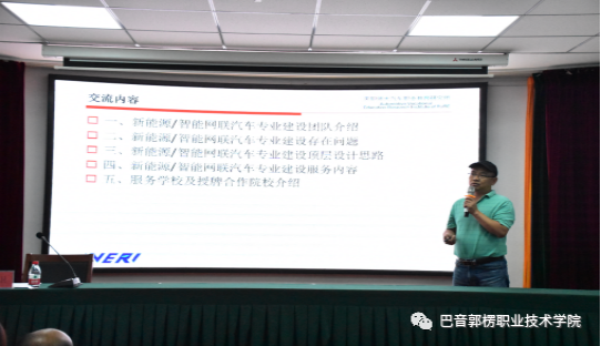仪式后,申荣卫以《基于工作过程的新能源汽车专业建设方案解析》为题进行了精彩讲座,从新能源/智能网联汽车专业建设存在问题、顶层设计思路、服务内容等方面进行了详细的解析,全面分析了新能源/智能网联汽车专业建设怎么去建设、如何建设等问题,得到在场热烈掌声和一致好评,