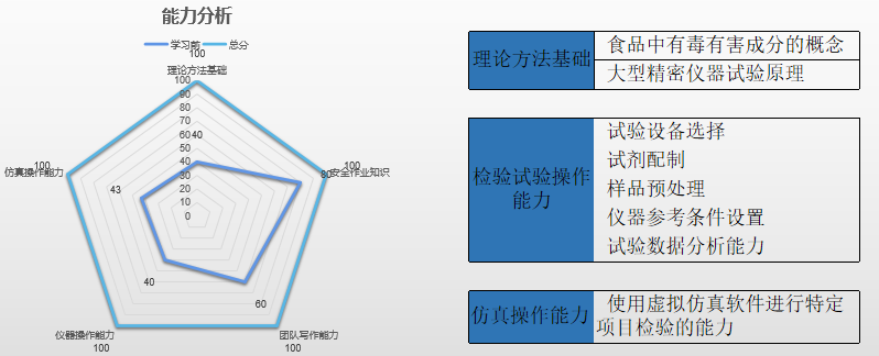 发布本次课预习任务单,学生进行线上自学和测评,教师进行线上测试并统计测试结果、据此调整教学策略并备课。 利用翻转课堂的教学模式,学生在课前已经了解有害物质的种类,对身体的危害,初步了解测定方法,课堂进行试验通讲,提高教学效率。 |