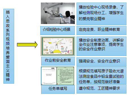(1)学生通过课前教学资源的学习、相互讨论和自我理解,讨论并回答有毒有害成分测定方法; (2)根据教师播放的动画,对精密仪器原子吸收分光光度计测定食品中铅含量有一定的基础理解。 (3)本项目对接职业院校技能大赛、粮农1+X食品安全评价项目--茶叶中重金属含量的测定。同学们深入了解,培养技术规范。 |