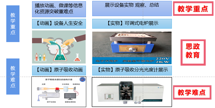 (1)通过原子吸收原理动画的观看,形象掌握该部分知识。 (2)观察可调式电热炉和原子吸收光谱仪设备,通过实物与原理的比照,理解重难点,了解仪器的使用方法。 |
