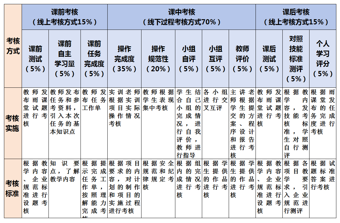 平时成绩=课前(课前测试+课前自主学习量+课前任务完成度)15%+课中(操作完成度+操作规范性+小组自评+小组互评)70%+课后(测试+对照技能标准测评+个人学习评分)15%