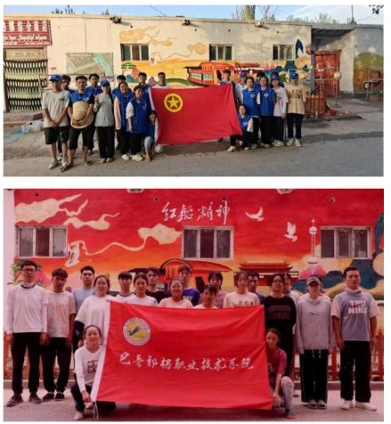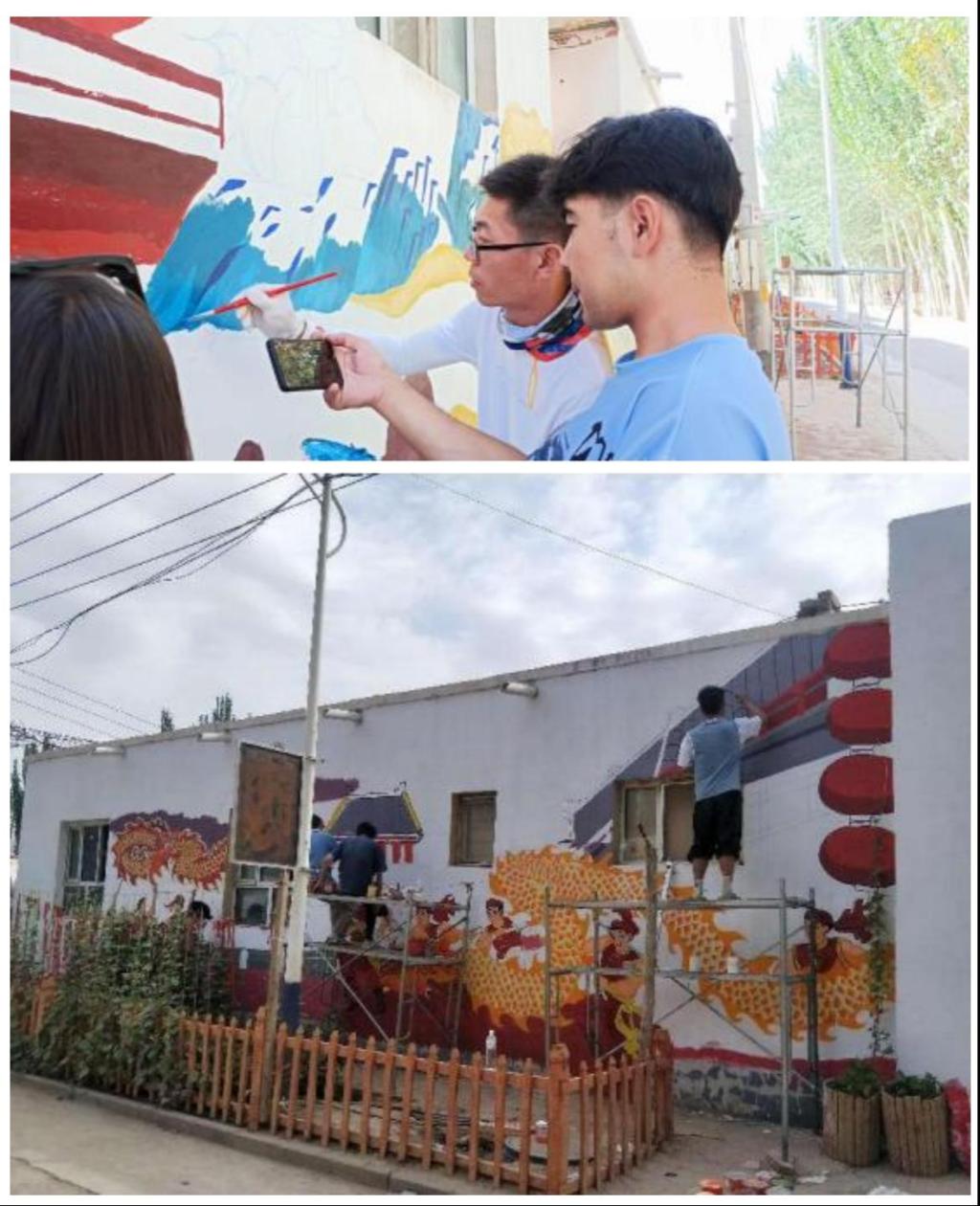 项目组成员在建筑装饰设计课程中结合思政元素拓展教学内容。202235月,组织学生开展了校园艺术教育实践活动2次,在校园公共区域进行了为期40余天的墙绘活动,绘制了10幅以红色党史为主题的墙绘和15幅以靓丽校园风景线为主题的墙绘,共计绘制校园文化墙500㎡;20221月,项目组成员与建筑装饰专业学生愿者队伍赴阿克苏柯坪县启浪乡进行了为期15天的乡村振兴志愿墙绘帮扶活动,共计绘制了25幅以红色党史为主题的文化润疆主题墙绘。20226月,项目组成员带领建筑装饰专业大学生志愿者,在阿克苏柯坪县进行了为期15天的美丽乡村志愿墙绘服务。绘制整体画作29副。两次志愿墙绘活动绘制农村院落墙体543000多平米。墙绘活动将艺术文化带进乡村,将庭院墙变文化墙,丰富了辖区群众的精神文化生活。社会艺术实践活动既锻炼了学生吃苦耐劳的品质,也受到了社会的高度认可和良好评价。艺术实践活动的开展,既检验了学生的专业素养,让学生对绘画与设计知识有了更深的理解;在社会实践活动中极大的提升了学生的艺术素养和审美能力,也激发了学生弘扬中华优秀传统文化的归属感、责任感和使命感。