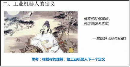 3.借用苏轼的《题西林壁》中的一句:横看成岭侧成峰,远近高低各不同来总结工业机器人的定义。提出思考问题:根据自己的理解,给工业机器人下一个定义。