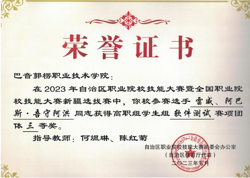 图5 大数据教研室教师指导学生取得2023年自治区技能大赛“软件测试”赛项获奖证书