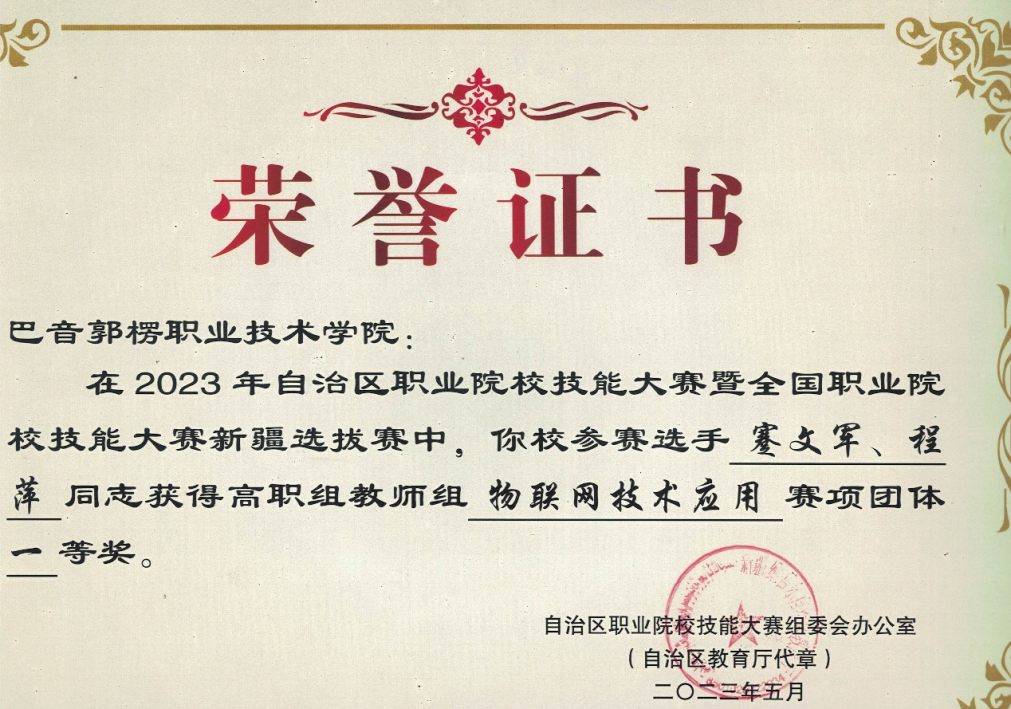 图5 电子信息工程技术专业教师取得2023年自治区技能大赛教师组“物联网技术应用”赛项一等奖荣誉证书