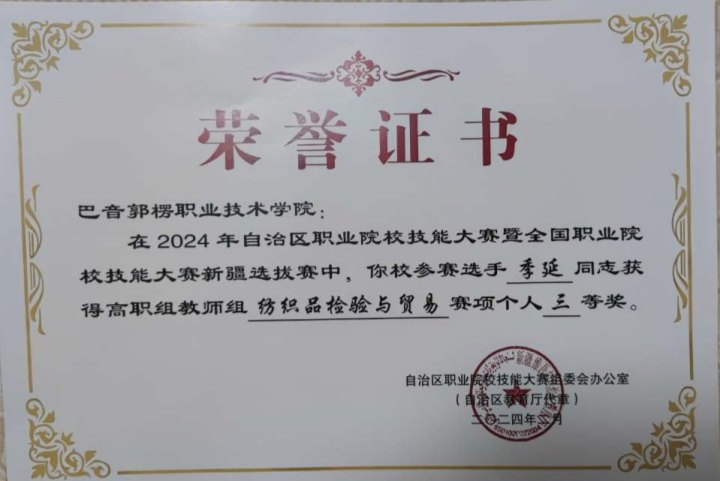 图7 自治区级纺织品检验与贸易技能大赛学生获奖证书